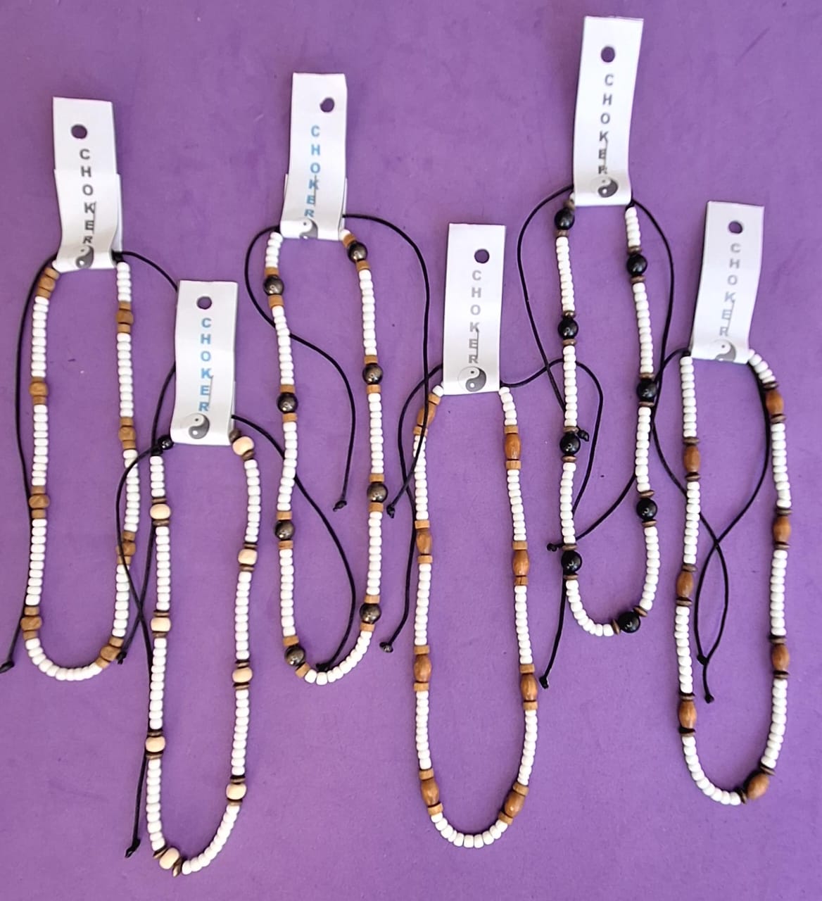 Collar choker regulable con cuentas de madera y mostacillas, en diseños y colores surtidos, por unidad.