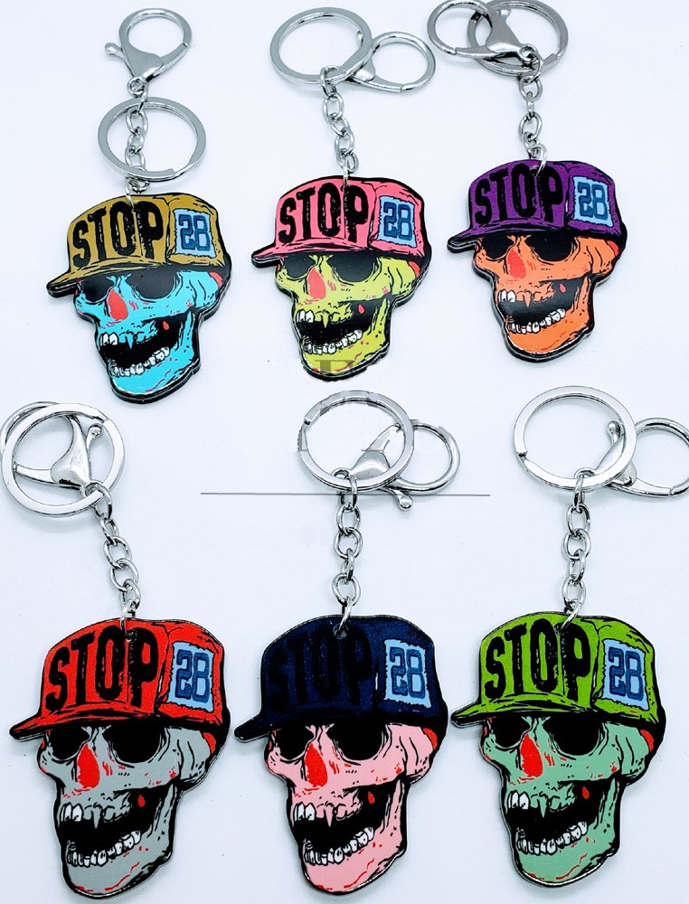 Llavero de acrílico con argolla y mosquetón de metal, con dije de zombie stop, en colores surtidos, por unidad.