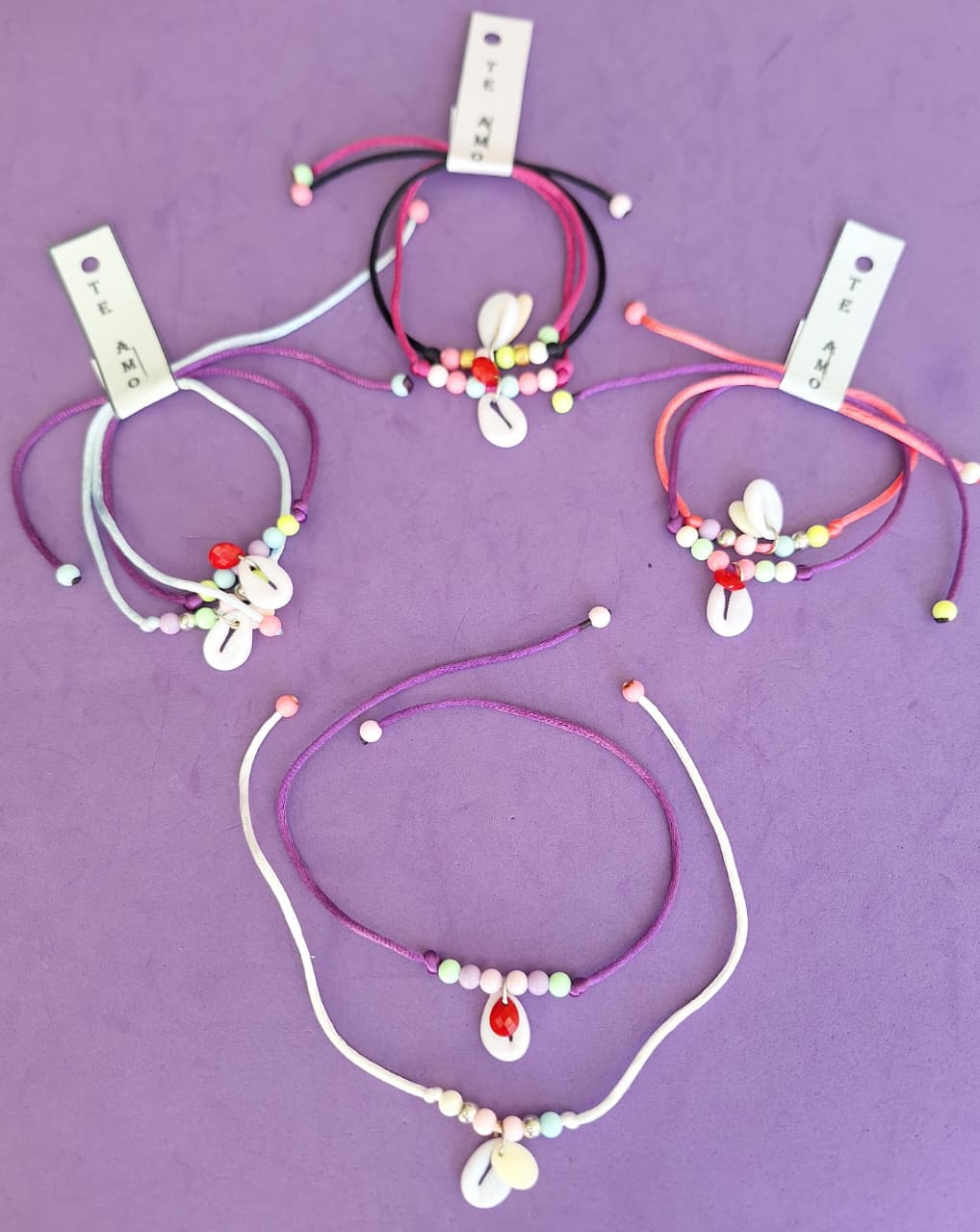 Pulseras/Tobilleras de cordón con cuentas y dijes de Buzios, en colores surtidos, por blíster de 2 unidades.